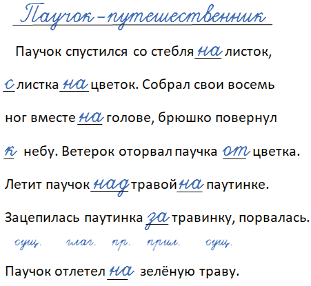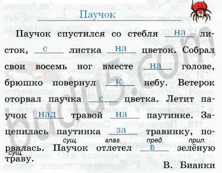 Паучок спустился со стебля __ листок, __ листка __ цветок. Собрал свои восемь ног вместе __ голове, брюшко повернул __ небу. Ветерок оторвал паучка __ цветка. Летит паучок __ травой __ паутинке. Зацепилась паутинка __ травинку, порвалась. Паучок отлетел __ зелёную траву.