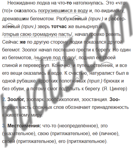 Неожиданно лодка на что (то) натолкнулась. Это «что (то)» ок..залось погрузивш..мся в воду и, по-видимому, дремавш..м бегемотом. Разбуже(н, нн)ый и ра(с, сс)ер-же(н, нн)ый зверь тот (час) же вынырнул и открыв свою громадную пасть начал громко реветь. Сейчас (же) по другую сторону лодки показался другой бегемот. Зоолог начал поспешно грести к берегу. Но один из бегемотов нырнув под лодку поднял её своей спиной и перевернул. Конечно, и путешестве(н, нн)ик и все его вещи оказались в воде. К счастью, натуралист был в одной рубашке, коротких полотня(н, нн)ых брюках и без обуви, а потому смог подплыть к берегу. (Я. Цингер)