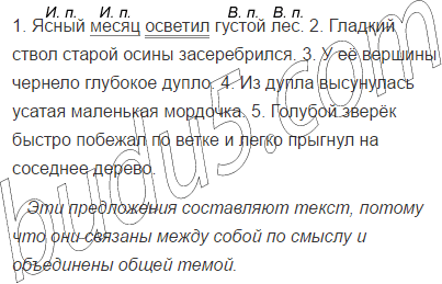 1. Ясный, осветил, густой, месяц, лес. 2. Гладкий, засеребрился, осины, ствол, старой. 3. У, чернело, её, глубокое, вершины, дупло. 4. Из, высунулась, усатая, головка, дупла, белки-летя́ги. 5. Через, миг, голубой, побежал, ветке, по, зверёк, на, прыгнул, дерево, легко, соседнее, и.