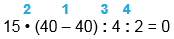 | 15 • 40 - 40 : 4 : 2 = 225 15 • 40 - 40 : 4 : 2 = 0 15 • 40 - 40 : 4 : 2 = 580 |