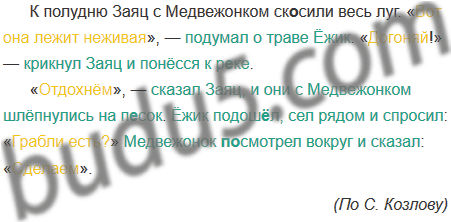 К полудню Заяц с Медвежонком ск. .сили весь луг. «Вот она лежит неживая», — подумал о траве Ёжик. «Догоняй!» — крикнул Заяц и понёсся к р..ке.