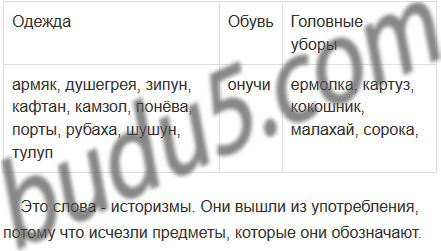 Запишите слова в три столбика: устаревшие названия а)одежды; б) обуви; в) головных уборов.