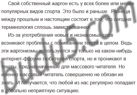 Из-за употребления новых и незнакомых слов возникают проблемы с пониманием текста в целом. Ведь эти слова, будучи по существу жаргонизмами, используются не только на каком-нибудь интернет-форуме любителей бокса или тенниса, где они вполне уместны. Они проникают в тексты, предназначенные, как говорится, для массового читателя. Но именно массоввый читатель совершенно не обязан их знать. И получается, что любой из нас регулярно попадает в довольно неприятную ситуацию.