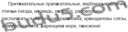 Прит..жательные прил..гательные, верблюж(?)я к..лючка, птич(?)и гнёзда, м..дведь, л..опард, расп..ложен, распол..гаться, (не)большая ост..новка, кр..кодиловы слёзы, ахи(л, лл)есова п..та, (Б, б)аренцев.. море, п..нсионат.