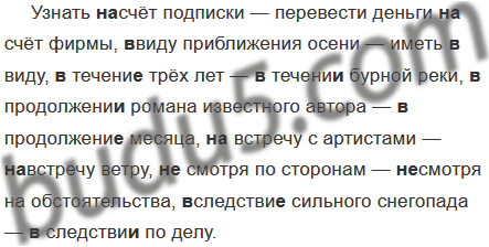 Узнать (на)счёт подписки — перевести деньги (на)счёт фирмы, (в)виду приближения осени — иметь (в)виду, (в)течени.. трёх лет — (в)течени.. бурной реки, (в)продолжени.. романа известного автора — (в)продолжени.. месяца, (на)встречу с артистами — (на)встречу ветру, (не)смотря по сторонам — (не)смотря на обстоятельства, (в)следстви.. сильного снегопада — (в)следстви.. по делу.