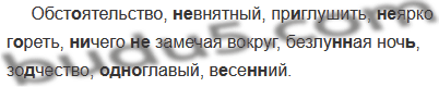 Обст..ятельство, (не)внятный, пр..глушить, (н..)ярко г..реть, (н..)чего (н..)замечая вокруг, безлу(н, нн)ая ноч(?), зо..чество, (одно)главый, в..се(н, нн)ий.