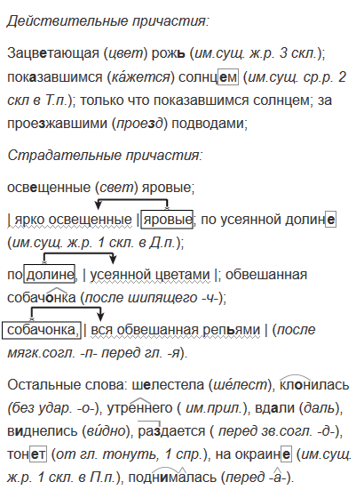 1. Бурая зацветающая рож(?) тихо ш..лестела колосьями и кл..нилась от утре(н, нн)его свежего ветерка; вд..ли ярко осв..щённые только что показавшимся солнц..м в..днелись яровые. 2. Ра(з, с)даётся звонкая песня, плывёт по обрыву, по долин.., усеянной цветами, и тон..т где-то на окраин.. леса. 3. Пыль на улицах тучами подн..малась вслед за прое(з, с)жавшими подводами. 4. Из-за ворот лениво залаяла собач..нка. вся обвешанная реп(?)ями.