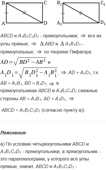 Докажите, что два прямоугольника равны, если: а) смежные стороны одного прямоугольника соответственно равны смежным сторонам другого; б) сторона и диагональ одного прямоугольника соответственно равны стороне и диагонали другого.