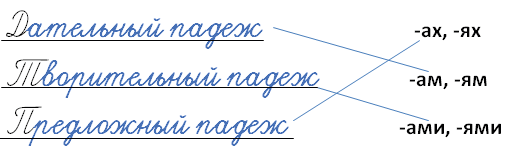Прочитайте. Допишите названия падежей. Соедините линиями названия падежей и окончания имён существительных в данных падежах.