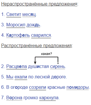 Пояснения: нераспространённые предложения состоят только из подлежащего и сказуемого; распространённые предложения состоят из подлежащего, сказуемого и второстепенных членов.